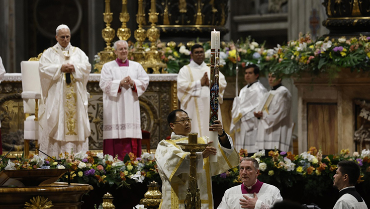 Sólo después de que el diácono pronunció tres veces la frase ‘Lumen Christi’ (La luz de Cristo) se encendieron todas las luces de la basílica y comenzó la misa ante miles de fieles, en la que se proclamó el ‘Exultet’, el himno pascual.
