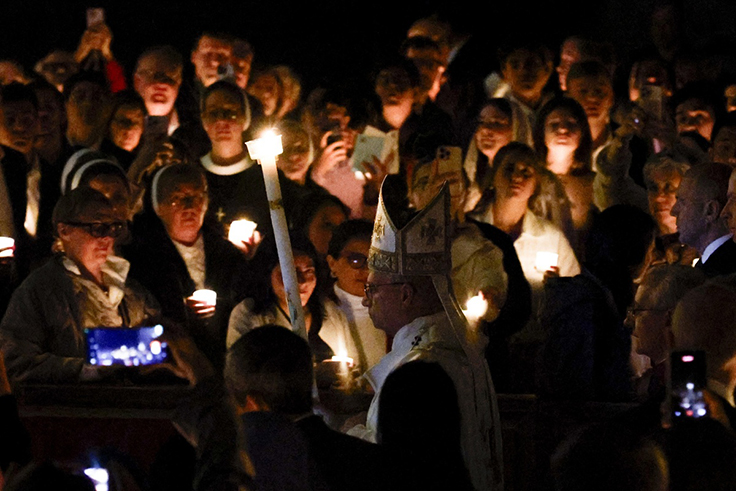 El papa estadounidense-peruano presidió por primera vez en su pontificado la Vigilia de Sábado Santo, una de las más largas de la tradición católica que se inició en una Basílica de San Pedro totalmente a oscuras y en silencio con el rito de la bendición del fuego y el encendido del cirio pascual.