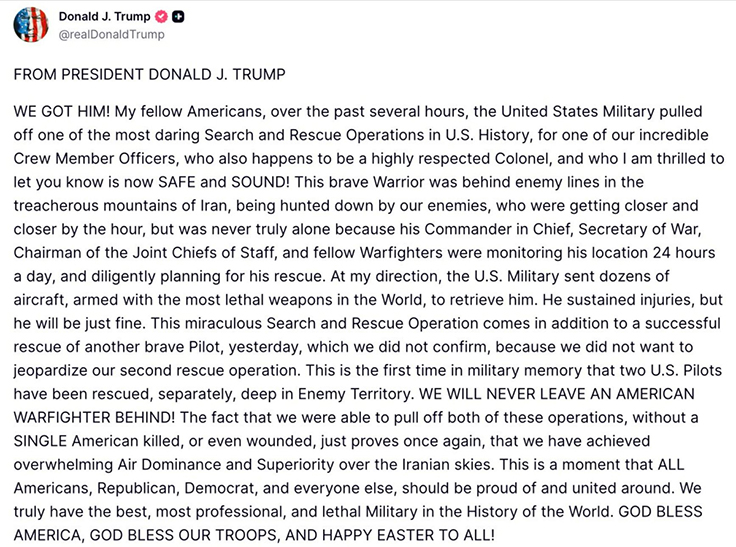 “¿Recuerdan cuando le di a Irán diez días para llegar a un acuerdo o abrir el estrecho de Ormuz? Se acaba el tiempo: quedan 48 horas para que se desate el infierno sobre ellos. ¡Gloria a Dios!”, había escrito el sábado el republicano en sus redes.